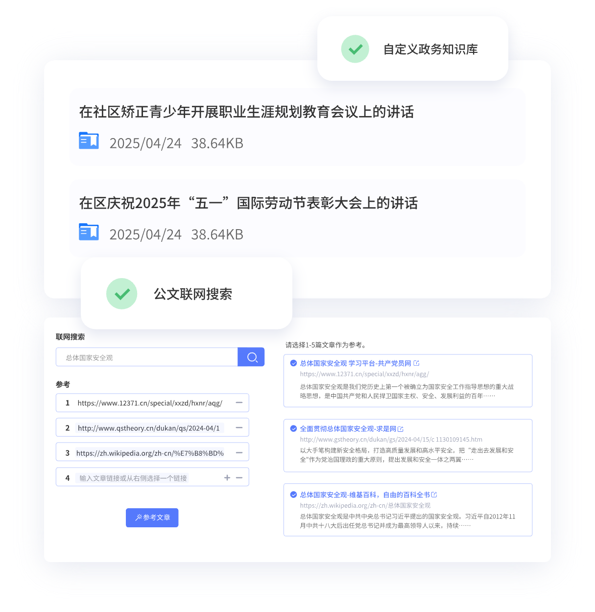 上傳政務(wù)或個(gè)人寫作常用材料,用于精準(zhǔn)生成符合自己寫作風(fēng)格的公文